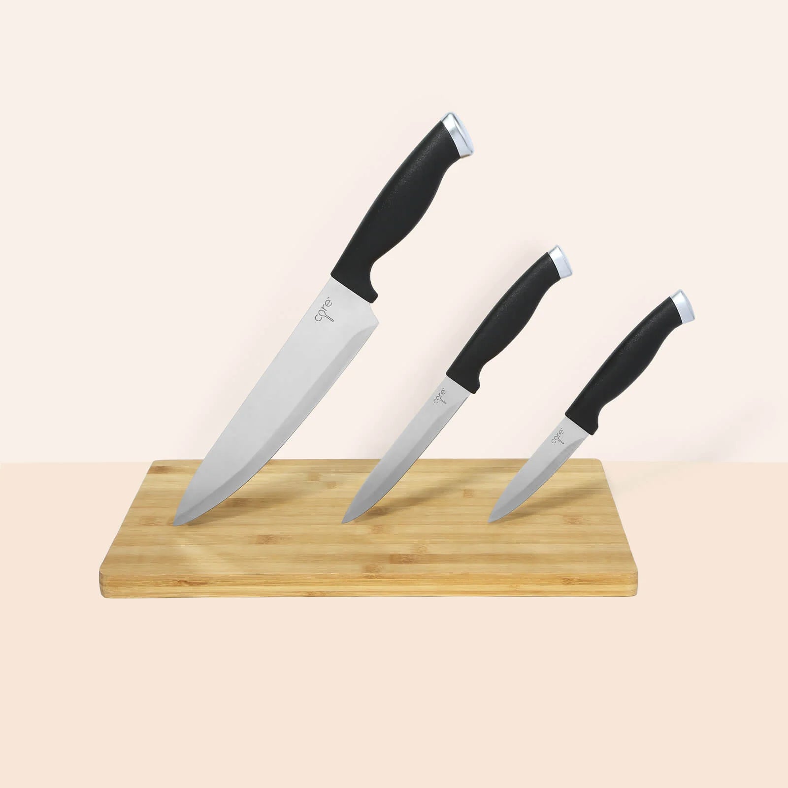 • Chefs Knife - An absolute Kitchen essential with an 8" blade, best used for anything from dicing meat & veggies to chopping nuts and herbs.