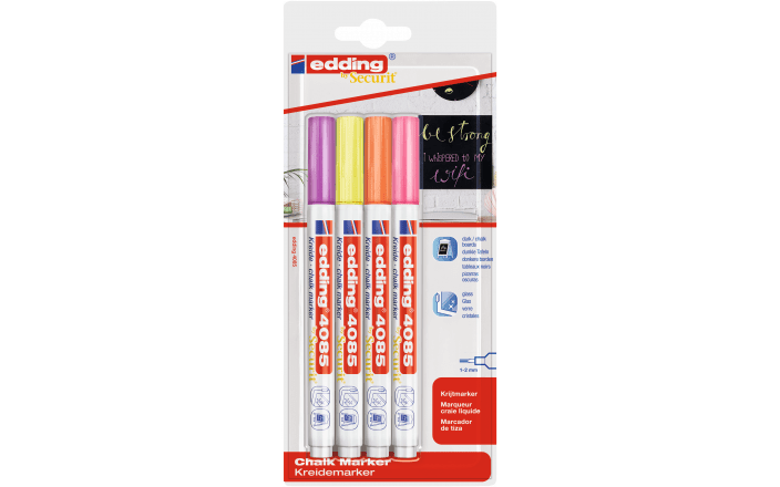 The round nib has a stroke width of 1-2 mm. The opaque, water-based liquid chalk with a neutral smell can be wiped off virtually all non-porous surfaces with a damp cloth.