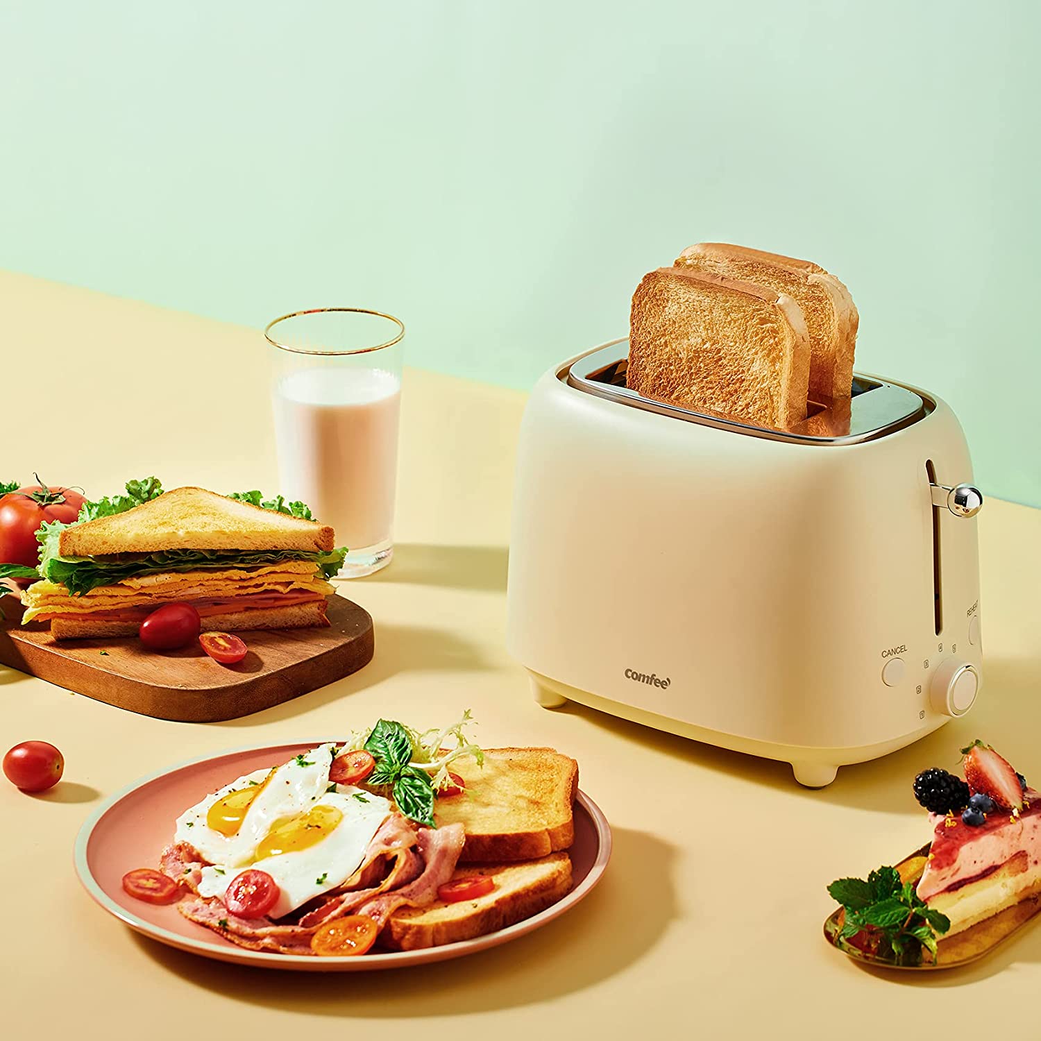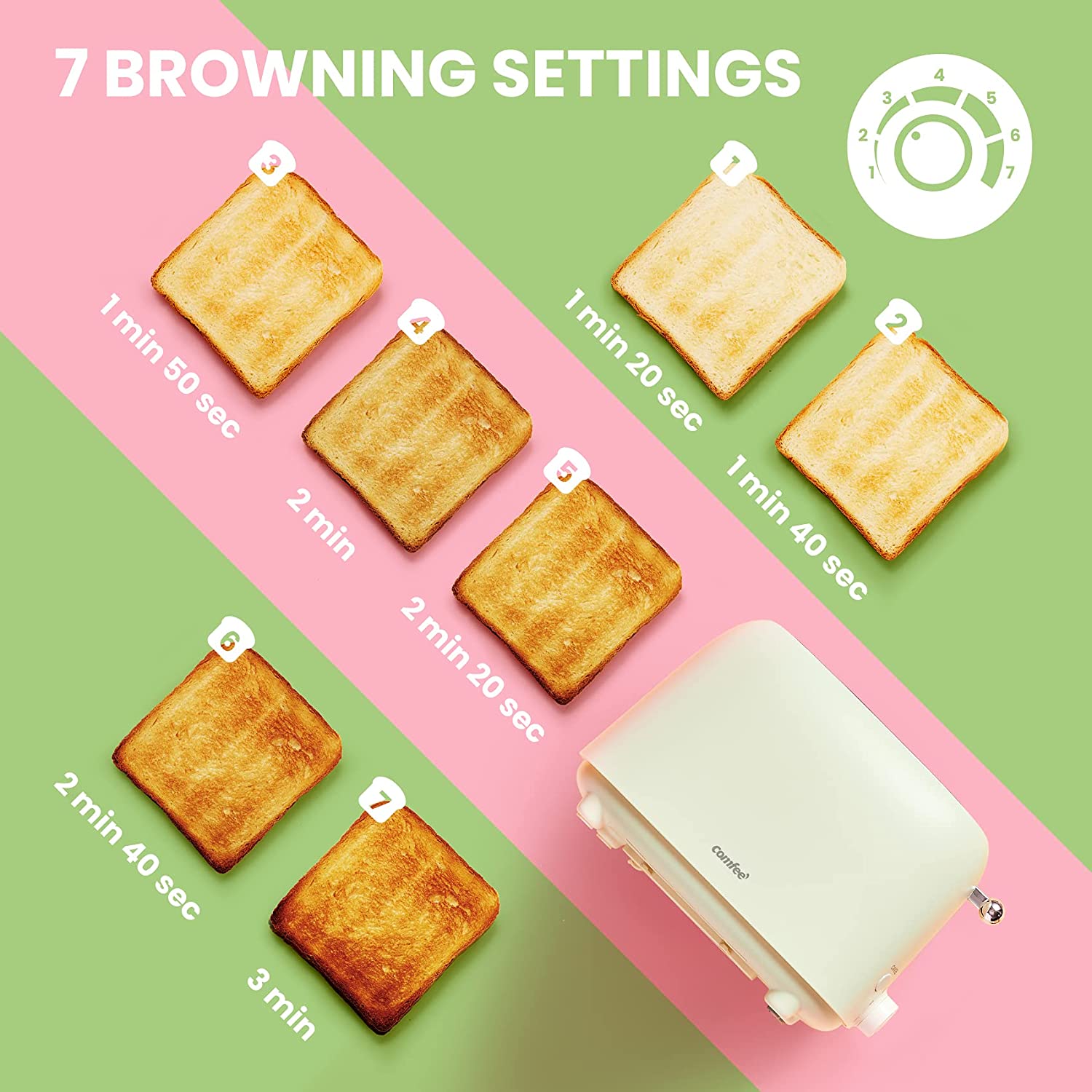 The Retro Cream Toaster has two extra wide (36mm) and deep slots (120mm) and 7 browning levels, the retro-style toaster can handle everything from thick-sliced bread to bagels with ease. It will pop up on its own after finish toasting, the easy way to prepare breakfast.