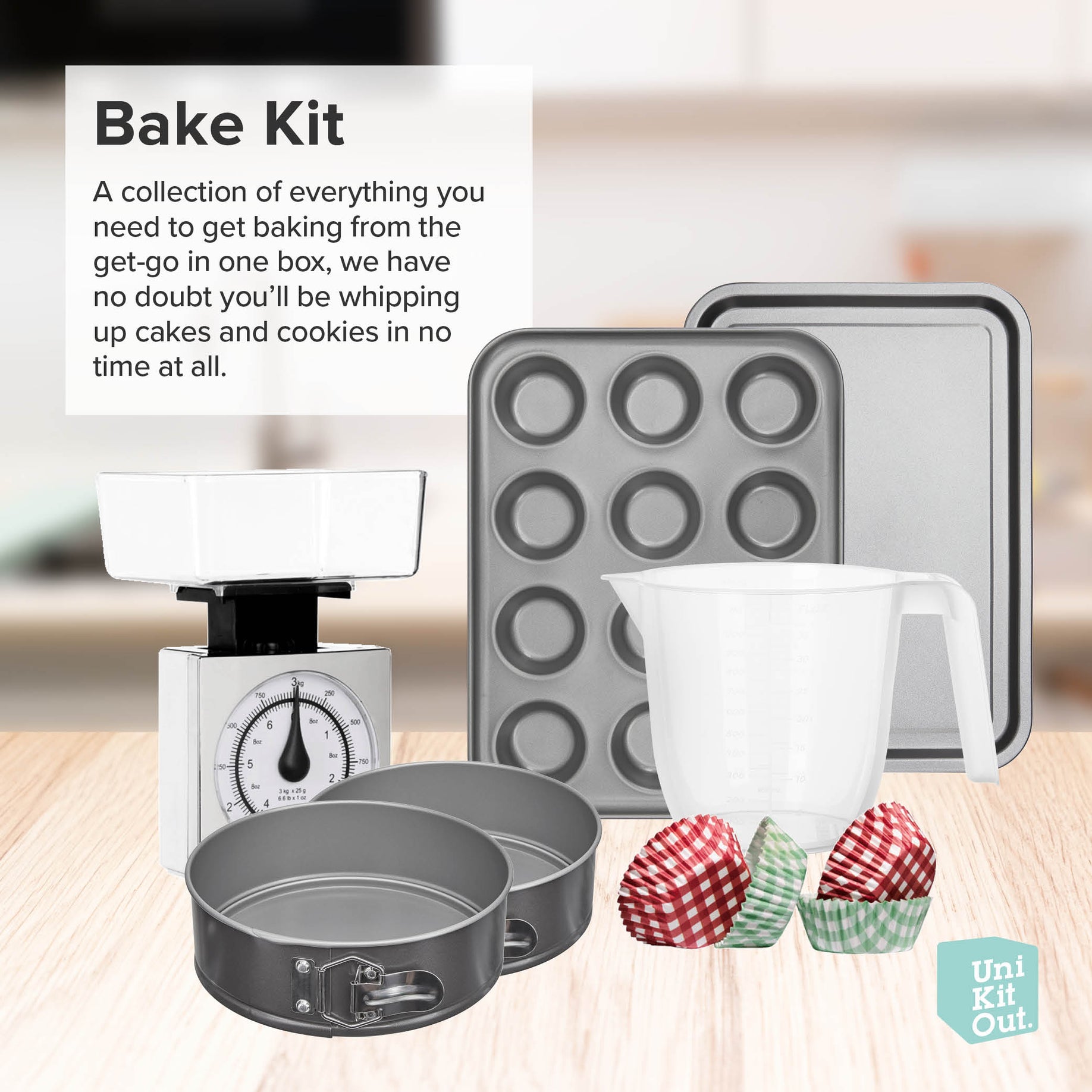 Contents: 1 x Baking Tray, 1 x Wooden Spoon, 1 x Mixing Bowl, 1 x Whisk, 1 x Measuring Jug, 1 x Rolling Pin, 1 x Sieve, 1 x Kitchen Scales, 1 x Cupcake Tray, 60 x Cupcake cases, 1 x Loaf Tin, 2 x Springform Cake Tins, 5 x Cookie Cutters and an Icing Syringe with 8 nozzles.