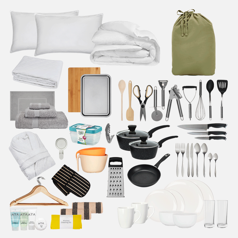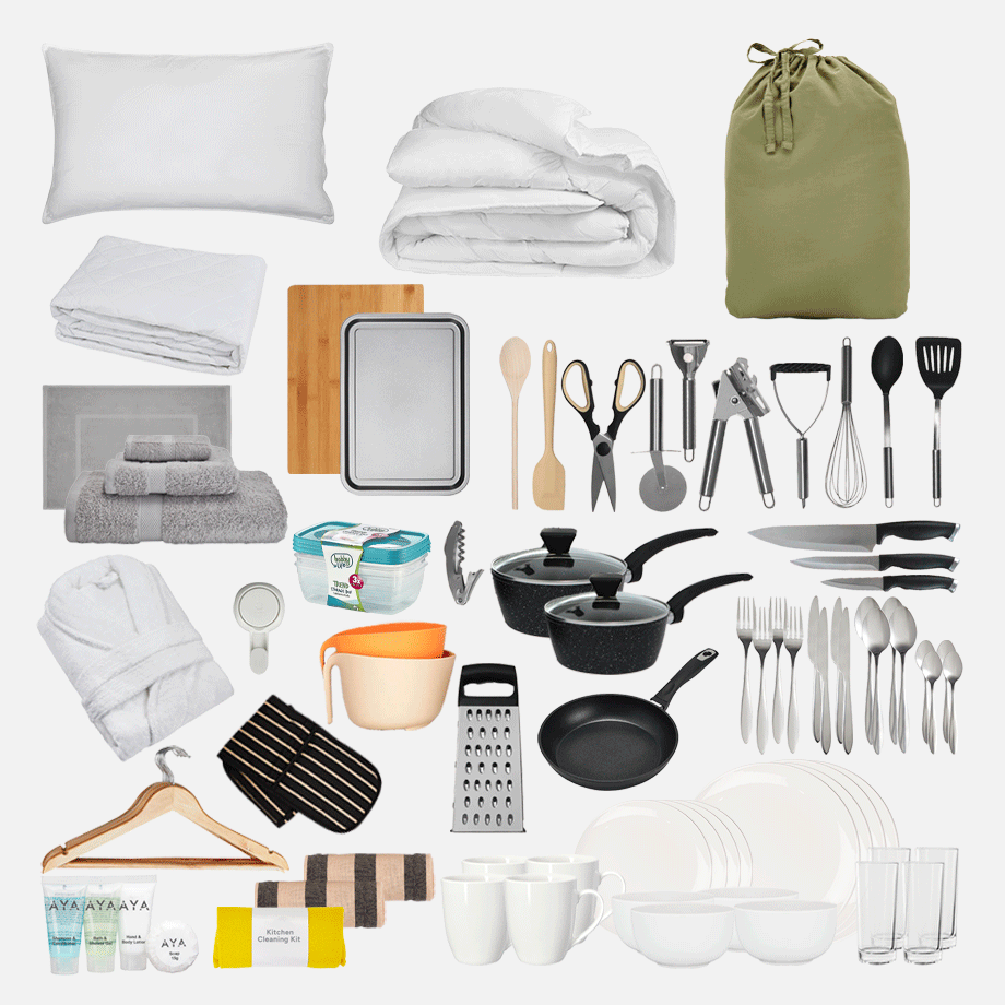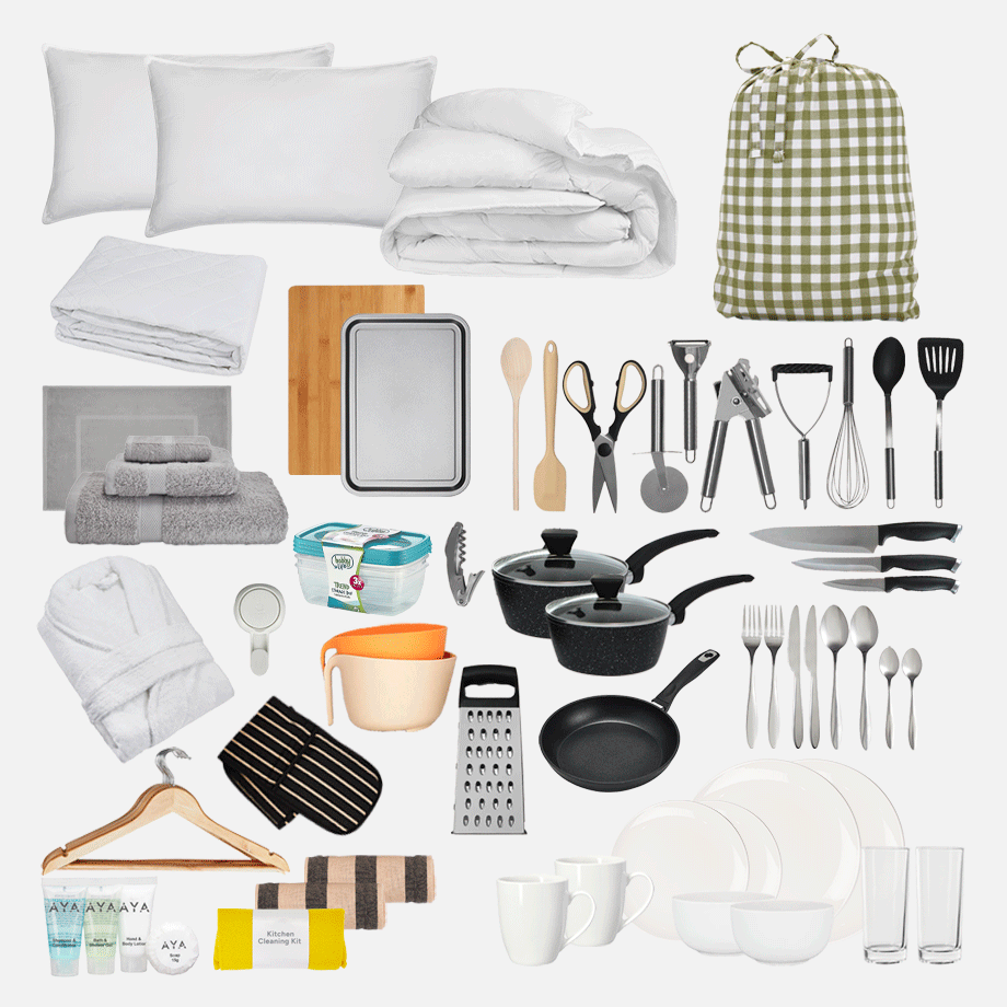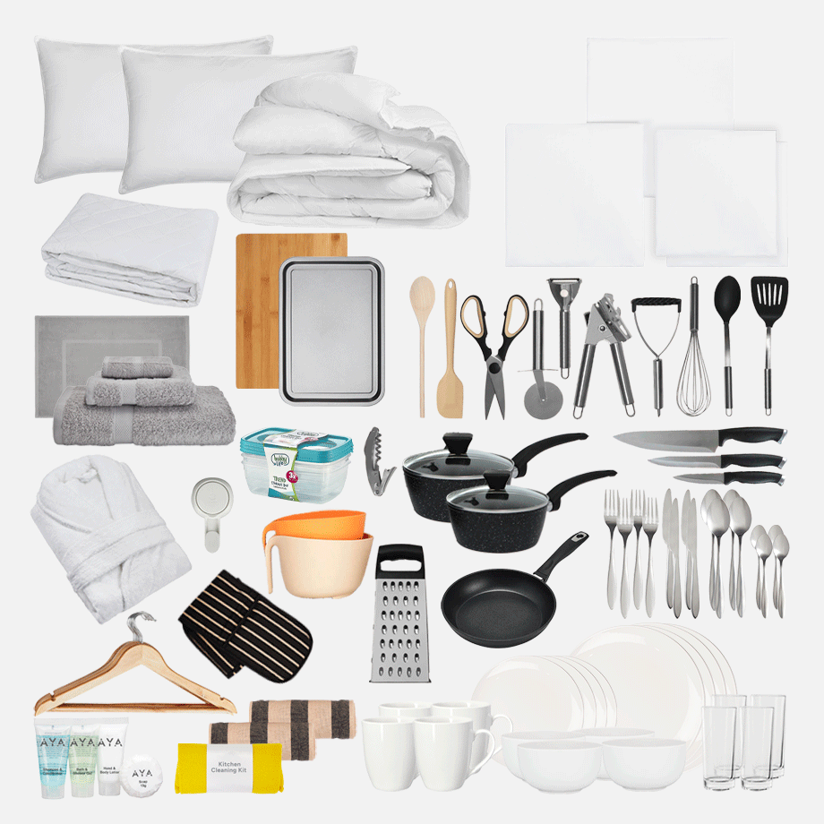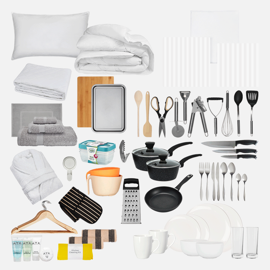 Bathroom Kit – No more sharing sponges or running to the shop for towels. This kit has everything you need to keep fresh, including towels, a bath mat, and handy bathroom must-haves.
