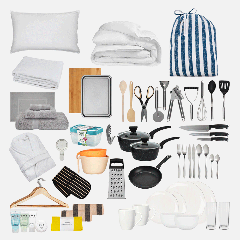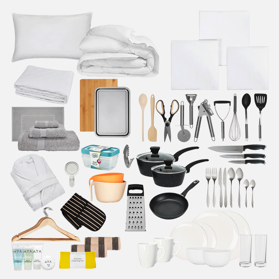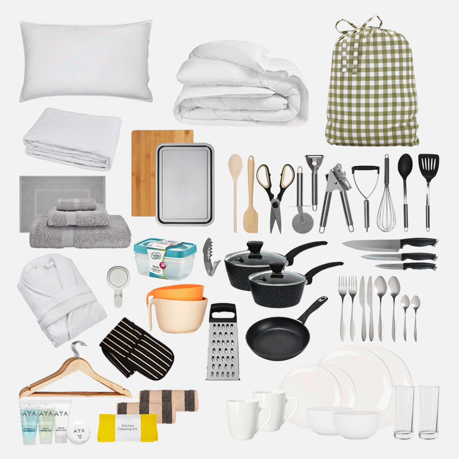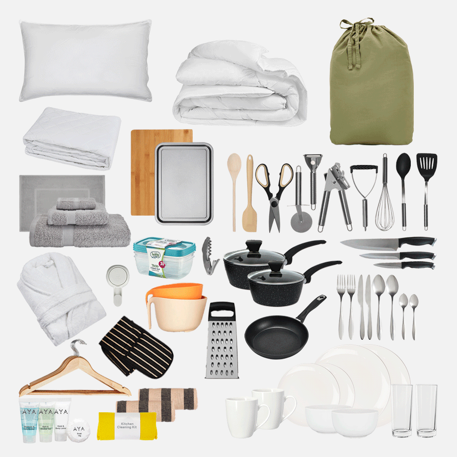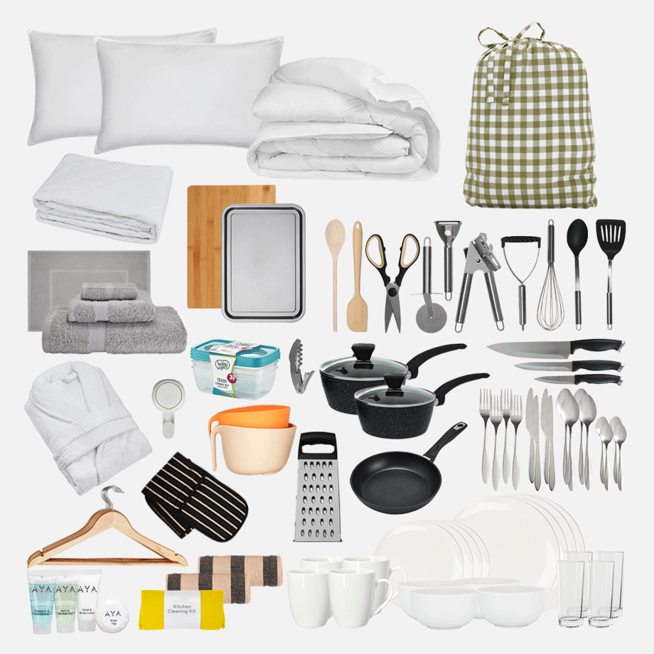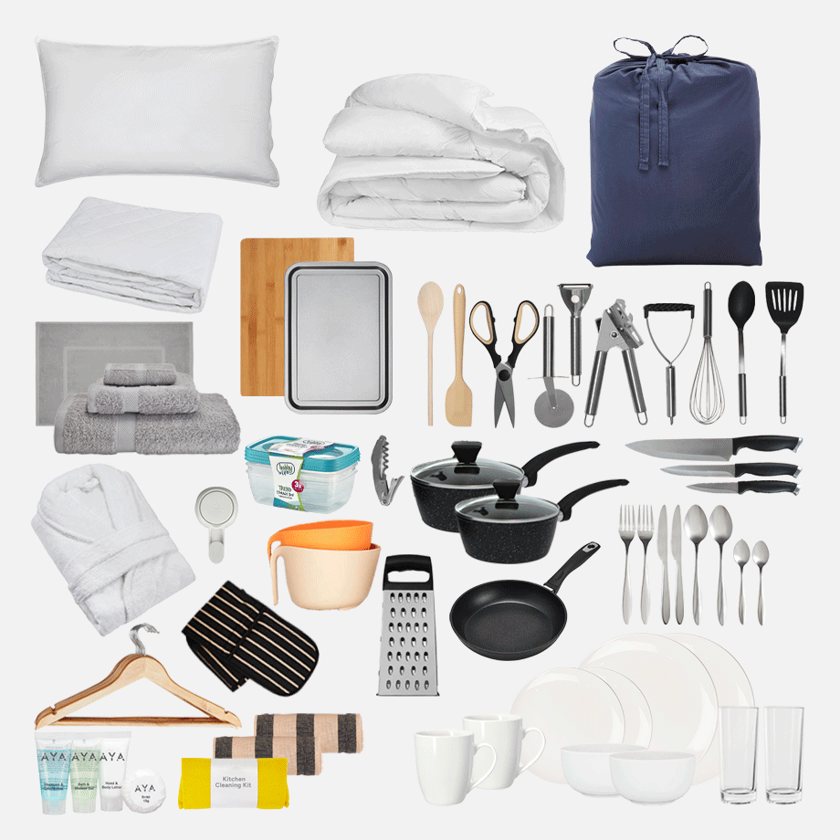Bathroom Kit – No more sharing sponges or running to the shop for towels. This kit has everything you need to keep fresh, including towels, a bath mat, and handy bathroom must-haves.