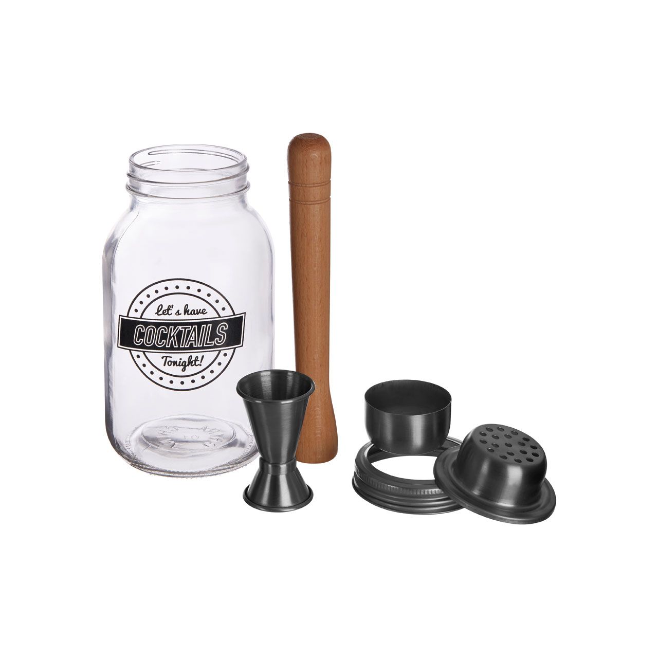 Made from clear glass, the 800ml jar features a fun "Let's Have Cocktails Tonight" message in bold black lettering. A muddler made from sustainable beech wood makes mashing ingredients easy, while the lid features a removable stainless steel strainer to trap ice and solid ingredients. An additional steel measuring cup covers the lid.
